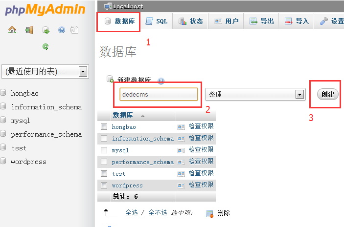 然后,打開MySQL的數(shù)據(jù)庫管理器,找到phpmyadmin,輸入控制面板的用戶名和密碼(都是root),然后創(chuàng)建一個(gè)網(wǎng)站的數(shù)據(jù)庫,比如我們可以創(chuàng)建一個(gè)名字為“dedecms的數(shù)據(jù)庫”,如圖。