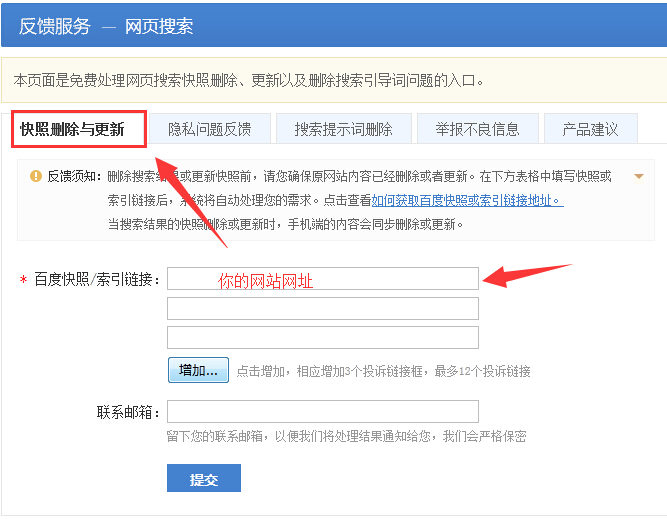 1、網站快照投訴,雖然說現在搜索引擎已經取消了快照,但是事實上快照還是有的,特別是在我們修改標題之后,你會發現很長一段時間你的標題還是 原來的標題而不是你現在修改的標題,面對這樣的情況我們就可以通過搜索引擎快速投訴入口進行提醒搜索引擎更新我們的網站快照內容。