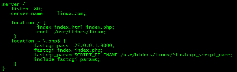 - fastcgi_param SCRIPT_FILENAME- /usr/htdocs/linux/- $fastcgi_script_name;- //- 當前虛擬主機對應的目錄
