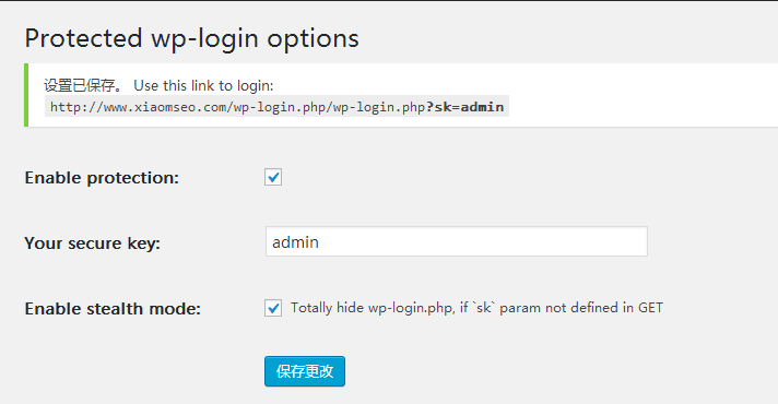 Enable protection:?jiǎn)⒂玫顷懕Wo(hù) Your secure key:你的自定義登陸地址,如果不是包含有這個(gè)安全秘鑰的登陸地址即使你的用戶名和密碼正確,都沒辦法登錄 Enable stealth mode:?jiǎn)⒂秒[身模式,如果不是包含安全密鑰的登陸地址,不會(huì)顯示登陸表單