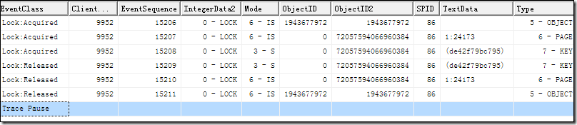 在SQL Server中,我們知道一個(gè)SELECT語句執(zhí)行過程中只會(huì)申請(qǐng)一些意向共享鎖(IS) 與共享鎖(S), 例如我使用SQL Profile跟蹤會(huì)話86執(zhí)行SELECT * FROM dbo.TEST WHERE OBJECT_ID =1 這個(gè)查詢語句,其申請(qǐng)、釋放的鎖資源的過程如下所示:
