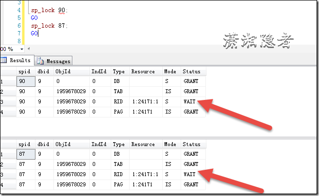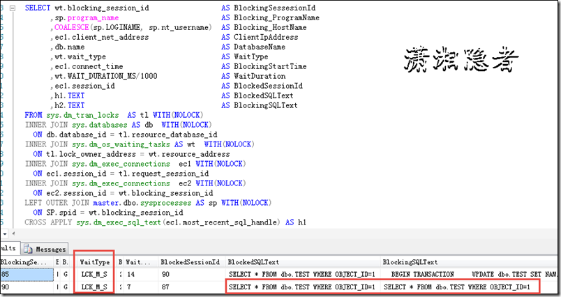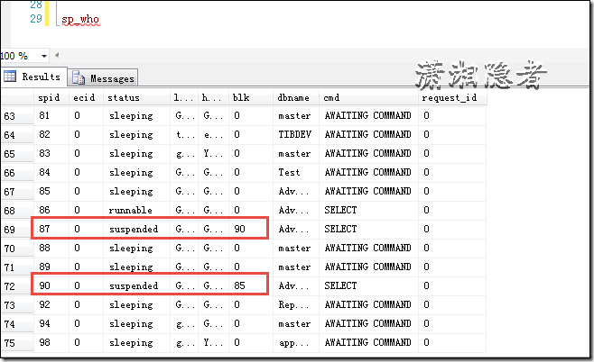 如下所示,你會(huì)看到SELECT語句“阻塞”了SELECT語句,即會(huì)話90“阻塞”了會(huì)話87, 它們的等待事件都為L(zhǎng)CK_M_S,也就是說它們都在等待獲取共享鎖,也許你會(huì)置疑這個(gè)SQL是否有問題,那么我們使用SP_WHO來查看,你會(huì)發(fā)現(xiàn)也是如此,如下所示: