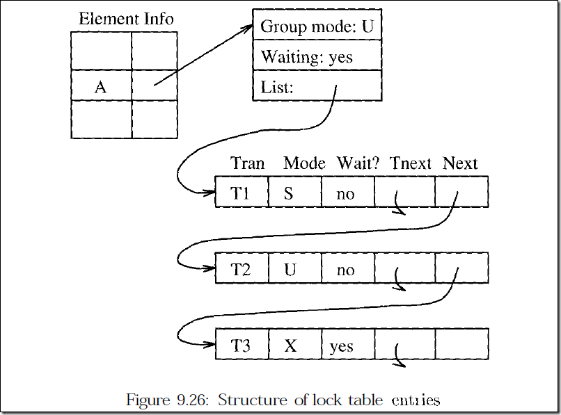 其實(shí)應(yīng)該說,會(huì)話87、90都在等待RID對(duì)象的共享鎖,我們知道共享鎖與意向共享鎖都是兼容的,所以SELECT是不會(huì)阻塞SELECT的,那么又怎么解釋這個(gè)現(xiàn)象呢?在宋大神的指點(diǎn)下,粗略的翻了Database System Implementaion這本書(很多原理性知識(shí),看起來相當(dāng)吃力)。里面介紹了在鎖表(lock table)以及Element Info、Handling Lock Requests、Handling Unlocks等概念,有一個(gè)有意思的圖所示,
