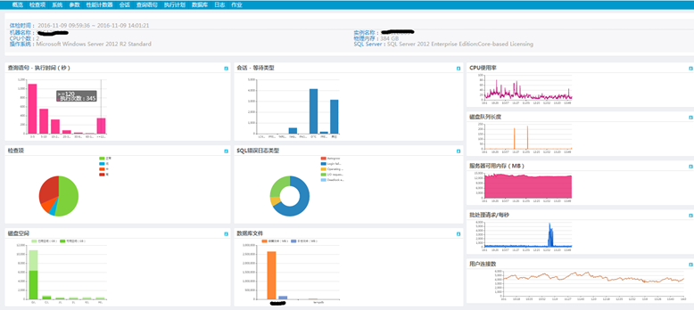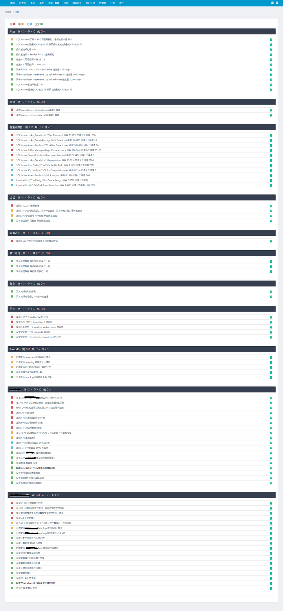 從系統、參數、會話、性能計數器、查詢語句、作業、日志、執行計劃、tempdb、業務數據庫多方面呈現系統存在的問題與隱患。