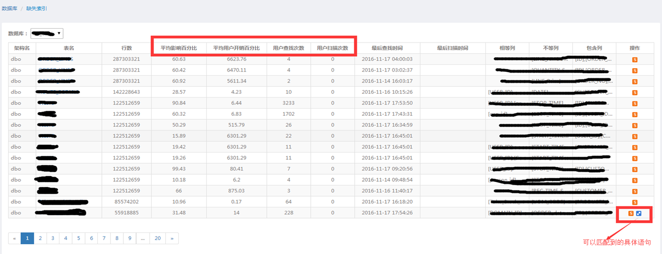 注:并非所有提示的索引都需要創建,根據【平均影響百分比】【平均用戶開銷百分比】【用戶查找次數】情況綜合評價,建立系統中缺失的重要索引。并綜合【相等列】【不等列】【包含列】創建包含多種情況的最優索引。