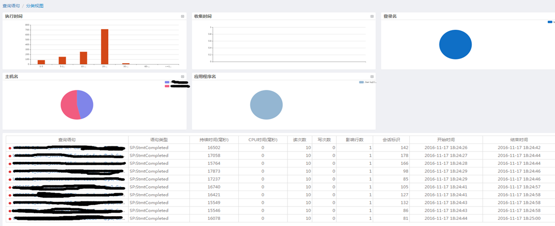 (本例:收集時間內語句執行時間在3-5秒的語句數量有1103條,5-10秒,10-20秒慢語句數量很多,說明系統語句執行緩慢,系統存在性能問題)