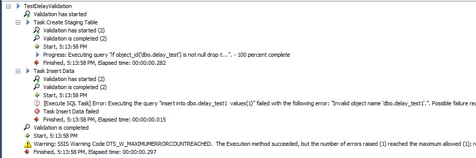 當啟用延遲驗證時,Package會執(zhí)行下去,知道運行到特定的組件時,才會執(zhí)行組件驗證,如果組件驗證失敗,那么拋出錯誤消息,停止Package的運行。