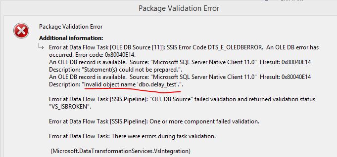 設(shè)置Package Level的屬性DelayValidation=False,Task Level的屬性DelayValidation=False,在Data Flow Task中,OLE DB Source組件從一個當前不存在的表dbo.delay_test中selelct數(shù)據(jù):