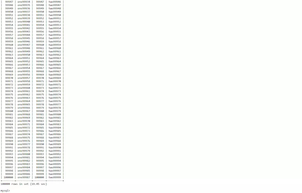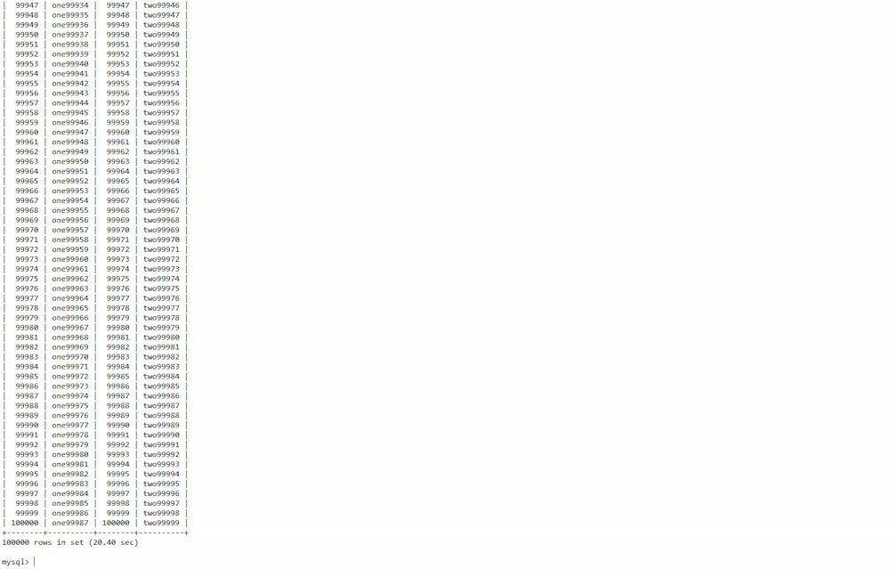 為了突出兩種查詢的性能差異,往one表中插入100w條數(shù)據,往two表中插入10w條數(shù)據,在大量數(shù)據面前,一絲一毫的差別也會被無限放大;這時候在來比較一下差異
