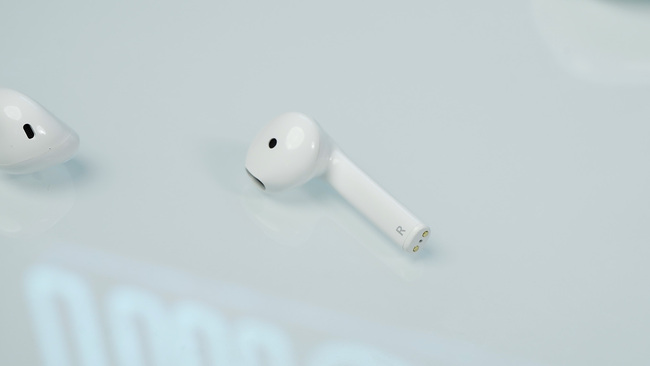 耳機本體是現在較為常見的TWS耳機主流設計,耳機柄稍寬一些,相比于橢圓形更接近R角過度弧線較大的圓角方柱形,底部的充電觸點位置有輕微內凹,這樣在佩戴時觸點更不容易暴露在外,耳機的一體性看起來更好。
