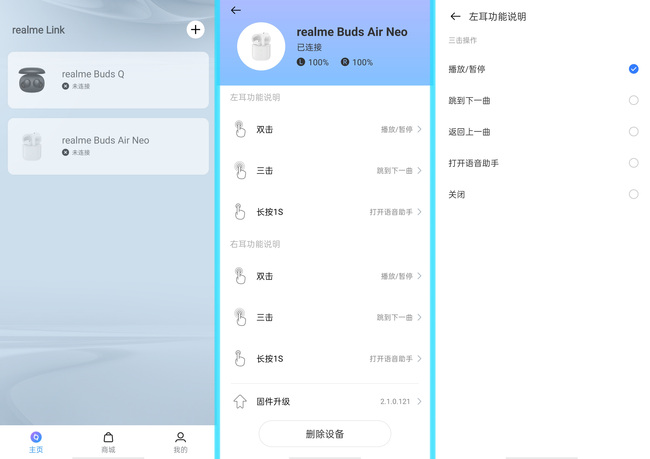 當前可以使用realme Link APP對耳機進行設置(兼容其他安卓手機),除了能分別查看左右耳電量以外,也可以對觸摸操作進行具體設置,比如左右耳的雙擊和三擊都可以設置成播放/上一曲/下一曲/語音助手等不同快捷方式。