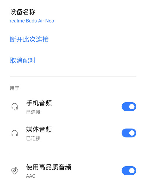 如果是聽歌比較多的同學,建議在藍牙設置中手動開啟AAC傳輸。realme Buds Air Neo采用了13mm的大尺寸發聲單元,配合DDB動態低音強化,實際聽感表現也很不錯,低音的量感和層次感都有較好表現,但是半入耳的設計導致封閉性會稍差一下,建議聽歌前可以手動調整到更舒服的位置,不然聲音會有一些松散,高音會比較尖銳。