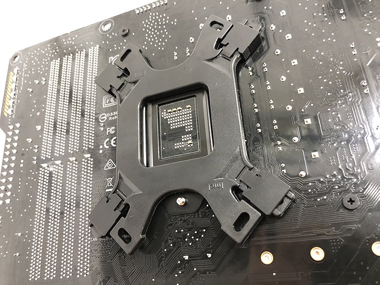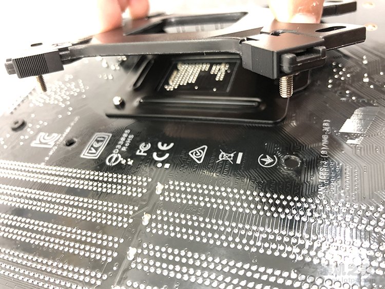 5、我們找到固定背板的四個六邊形螺絲,先用手逐個擰上去,然后我們散熱器盒裝附送的“套筒”套在六邊形螺絲上,使用十字起子將四個六邊形螺絲擰緊。