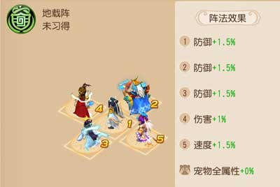 地載陣(三防1傷1速):注重防御的陣法,比較適合控制或輔助型職業,5號位上提升速度建議使用封印型伙伴,通過不但的控制和消耗磨死對手。