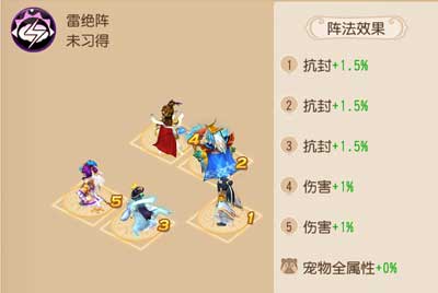 雷絕陣(3抗封2傷):同樣是針對型的陣法,比較克制方寸山和獅駝嶺,在一些特殊戰斗或PK中有奇效。