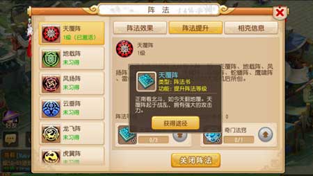 每個陣法都有5個等級,可以通過相應的陣法書來提升,提升陣法等級可以增加法陣中各各陣位的屬性加成,大大提升我方戰斗力,尤其是一些特殊陣法,只有達到高等級之后,才能發揮其真正的效果,所以不要盲目的收集陣法,專心升級2~4個即可。另外,我們還可以使用奇門法竅來增強陣法中出戰寵物的屬性。