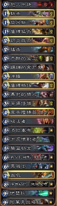 在傳統(tǒng)土豪戰(zhàn)基礎(chǔ)上,加入了一套 怒火中燒、沖鋒、狼人。形成吼爹和狼人的雙沖鋒斬殺核心。去掉的3張牌在不斷調(diào)整中,目前是去掉2張鑄甲師1張猛擊。