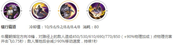 1、牛魔的二技能向指定的方向沖,對路上的敵人造成傷害。