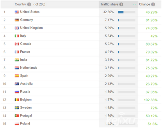 為一加官網貢獻流量最多的15個國家