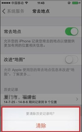 1、找到“常去地點”的歷史記錄并刪除。通過“設置”->”隱私”->”定位服務”->”系統服務”->“常去地點”,可以看到下面的“歷史記錄”,里面記錄著詳細的時間和活動地點。最下面有個“清除歷史記錄”,擊并并確認清除記錄。