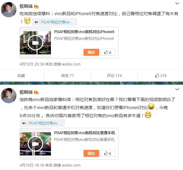 不過值得注意的是,在vivo公布新機(jī)之前,曾有關(guān)于該機(jī)的大量猜測,其中不乏vivo Xplay5S和vivo Xshot3這樣的合理信息,其中知名互聯(lián)網(wǎng)自媒體@俊明說 還在其微博公布了兩段視頻,表示vivo新機(jī)將在國內(nèi)首次采用PDAF相位對焦技術(shù),部分場景甚至達(dá)到了真正的0秒對焦,秒殺iPhone 6。從視頻情況來看,該說法基本屬實(shí)。