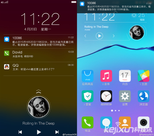 另外,最值得注意的是,基于Android 5.0深度定制的Funtouch OS 2.1系統(tǒng)在鎖屏界面上加入了可以顯示信息詳細(xì)內(nèi)容的消息通知欄,和iOS非常類似,并且效果看起來非常唯美。
