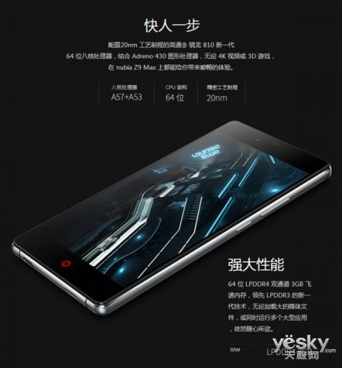 nubia Z9 Max是集眾多光環于一身的機型,搭載了時下性能最強勁的高通驍龍810處理器,也是現時國內首款上市的驍龍810機型。內存方面,依然維持在旗艦級別,LPPDR4 3GB64位雙通道內存加持,相信性能方面會有一個很強勁的表現。nubia Z9 Max實現了4G全網通,。同時率先在一體化成型機身上實現了雙SIM卡槽與TF卡槽的整合設計,以1+1=3的空間哲學優化工業設計,為用戶帶來更便捷的操作體驗。