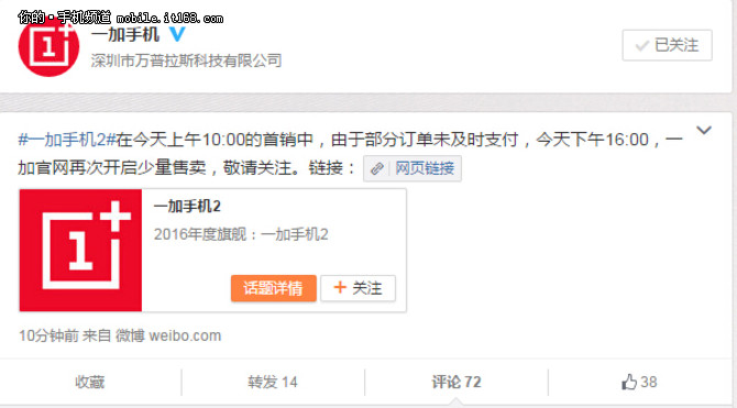 【 什么值得買】一加手機2在今天上午10點開啟首銷,不錯的外觀設計以及質感、指紋識別功能、頂級的硬件配置等都是該機突出的亮點。供貨3萬臺僅用64秒即售罄,讓不少想要入手一加手機2的朋友捶胸頓足,也可見一加手機2的熱度。剛剛一加手機官方微博宣布將在今天下午16:00點再度開啟少量售賣。上午沒有搶到的朋友不妨再試一下。