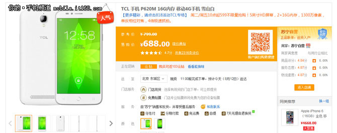 599元價位可能你會選擇紅米,但是市面上還有不少599元高性價比的手機,何必要選紅米呢?TCL P620M就是其中一款,TCL P620M搭載了一顆MT6732 64位四核處理器,配備2G RAM+16GB ROM,并采用了一塊5.0英寸720P屏幕,TCL ono P620M定價僅需599元,目前蘇寧易購每逢周二和周五10點都有現貨原價599元發售,感興趣的朋友趕緊前往官方商城下單吧。