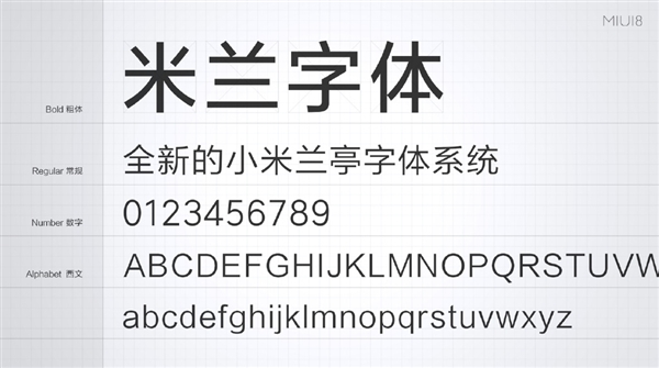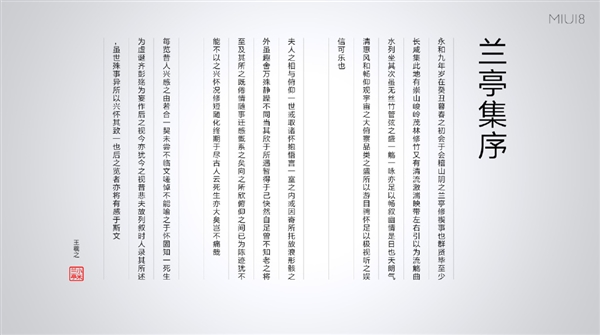 而在MIUI 8中,小米還推出“小米蘭亭”字體,經過18個月精心打磨,從中宮調整,到重心設計,全部根據移動互聯網的展示和閱讀特性做了細致的設計。