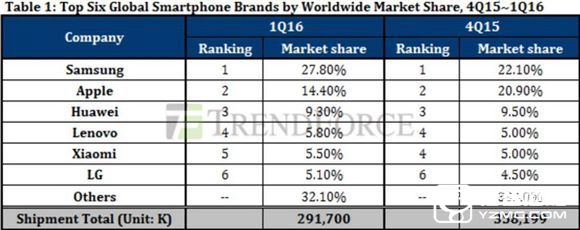 2016年4月底的時候,根據TrendFroce等機構出具的全球第一季度智能手機出貨量報告。2016年Q1的總出貨量為2.9億部左右。其中,三星的市場份額為27.8%,蘋果為14.4%,華為為9.3%,是全球智能手機2016年Q1出貨量的前三名。此外,蘋果手機比同期大跌了5.5%的市場份額,創造了近十三年來的最差紀錄。