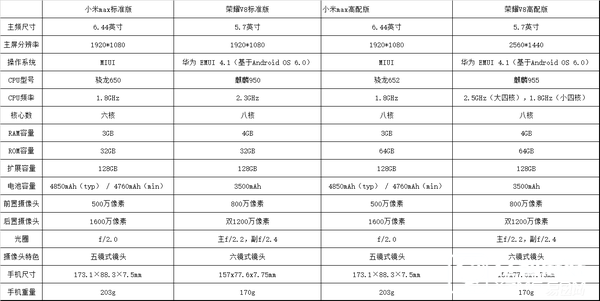 這 是貓咪整理的一些比較重要的參數信息,從上到下以此來看。首先,分辨率上榮耀V8高配版采用的是2K屏幕,這也是華為+榮耀推出的首款2K屏手機,在屏幕 顯示上貓咪可以很負責地告訴你,2K屏比其它三款清晰很多。系統的話,榮耀采用的是當前最先進的安卓6.0,不過這個后期都可以升級所以貓咪也不過多描述 了。CPU的話,大家可以先參照前面說的數字越大越好,然后貓咪給你舉個例子:榮耀V8在不考慮熄屏快拍功能的前提下,打開相機功能直至其自動對焦只需用 時約0.3s,這一點小米max明顯慢一點,具體應用在哪些方面呢?比如你突然看到一只很漂亮的鳥飛落在你前面,你準備拍它,就這0.3s的時間差小鳥飛 走了。所以強大的處理器無論是在系統運行流暢度還是軟件啟動速度方面都起著至關重要的作用,而榮耀V8用的華為自行研發目前最先進的麒麟955/950顯 然比驍龍650好很多(驍龍已經出到820了),另一方面CPU頻率也甩了小米max幾條街。至于內存的話,貓咪覺得如果你有3G的運行內存是沒有必要考 慮換4G運行內存的(指同一款手機的情況下),因為作為普通用戶你體會不到有多大區別,所以這個真的不是越大越好。電池容量上這兩款都能滿足一天的使用, 如果你不是重度手機用戶,小米max4850mAh的電池甚至可以使用兩天(雖然它屏幕大,但是這個真的可以有)。這對于貓咪這種總是忘給手機充電還嫌充 電寶重不愿意帶的懶人來說簡直是福音。