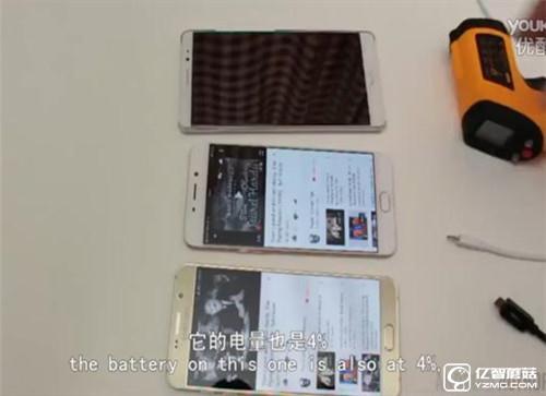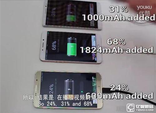 從視頻上可以看出,三星Note5的起始電量是4%,OPPO R9的起始電量是4%,華為Mate8的起始電量是5%,這三款手機同時開始充電,充電半個小時之后,三星Note5的電量是24%,充進了600mAh電量,OPPO R9的電量是68%,充進了1824mAh電量,華為Mate8的電量是31%,充進了1000mAh電量。