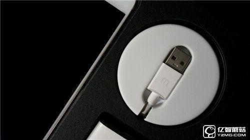 打開包裝蓋,我們可以看到一些主要配件,主機一臺,電源適配器和USB數據線,在這里值得一提的是主機和配件的擺放,數據線被放在一個圓形的收納盒中,而包裝盒,主機和電源適配器又是圓角矩形,所以整體視覺效果很棒,加上黑白的主題色,顯示出來一種純凈美。