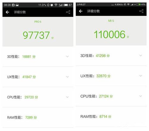 在安兔兔跑分中,Pro6跑出了97737的成績,而小米5標配版雖然搭載的是降頻版820,但是跑分也輕松破十萬分。來看得分細節,3D性能得分小米5比Pro6高出不少,RAM性能方面Pro6不敵小米5,小米搭載的是3GBLPDDR4內存,而Pro6則采用的是4GBLPDDR3內存,雖然在內存大小上Pro6高于小米5,但是還是不能小看LPDDR4的性能的。CPU方面X25戰勝了降頻版820。多核性能強悍。
