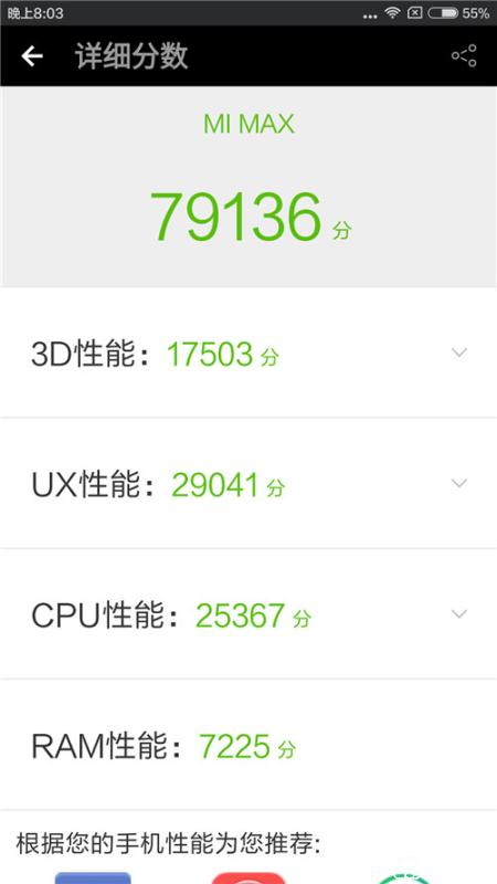 跑分結(jié)果雖不能完全代表性能,但7萬9的跑分成績來看,小米Max應(yīng)付日常的上網(wǎng)、播放視頻和游戲(有一些游戲會(huì)出現(xiàn)不兼容的狀況)是完全夠用的。當(dāng)然,拋開中規(guī)中矩的性能,最令人滿意的是小米Max的電池續(xù)航。