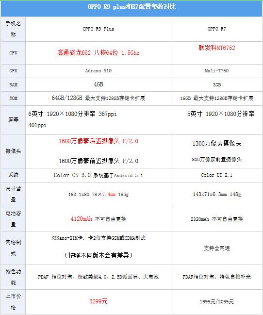 先來看看OPPO R9 Plus和R7配置參數對比,具體如下所示: