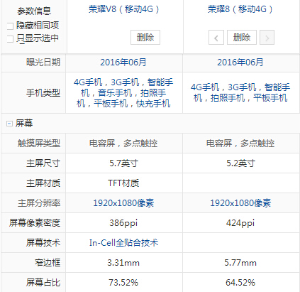 華為榮耀8和華為榮耀V8配置參數對比測評