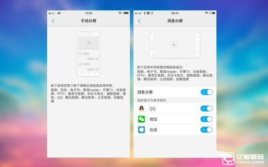 手動分屏時,三指同時下滑即可顯示微信、QQ、信息通訊軟件,生活娛樂兩不誤(注:分屏多任務適用視頻、電子書、歡樂斗地主以及各大視頻APP,一些軟 件可能不支持)。消息分屏則為QQ、微信、信息有通知時,自動出現于屏幕右端,點擊相應圖標并拉開即可實現消息分屏功能(注:消息分屏支持軟件與手動分屏 相似)。