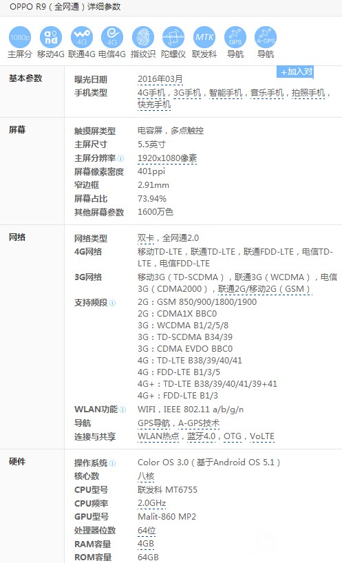 手機(jī)內(nèi)置聯(lián)發(fā)科Helio P10 MT6755 2.0GHz八核64位處理器,搭配4GB RAM,內(nèi)置64GB機(jī)身存儲(chǔ)空間,支持128GB microSD卡擴(kuò)展。作為一款全新的智能手機(jī),OPPO R9全網(wǎng)通 版本支持中國(guó)聯(lián)通、中國(guó)移動(dòng)和中國(guó)電信的4G/3G/2G網(wǎng)絡(luò)。全新的全網(wǎng)通2.0,允許用戶任意將移動(dòng)4G卡、聯(lián)通4G卡和電信4G卡搭配使用,任意一張卡都可選4G網(wǎng)絡(luò),另一張為2G網(wǎng)絡(luò)。