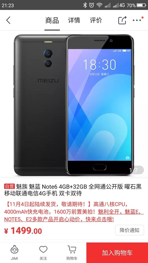 今天京東平臺意外上架了 魅藍Note 6 4+32GB版本,售價1499元,比4+64GB版本便宜了200元。