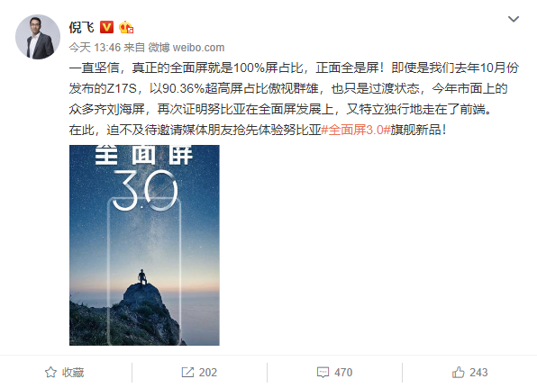 或許正因為如此,努比亞好像和“全面屏”這個話題杠上了。今天上午,努比亞手機聯(lián)合創(chuàng)始人倪飛在微博上正式公布了新旗艦的消息。他表示,全面屏3.0的時代就要來了。