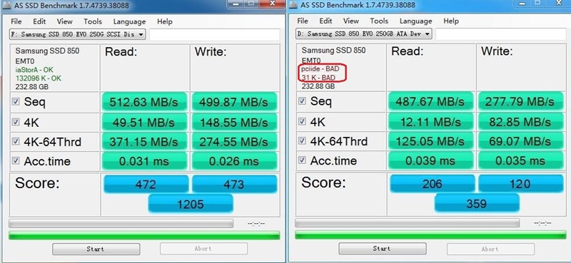 沒有AHCI與4K對齊時,在AS SSD Benchmark軟件中,會出現(xiàn)pciide-BAD以及31K-BAD的紅字。此時的性能慘不忍睹,只發(fā)揮了SDD 1/3不到的性能。