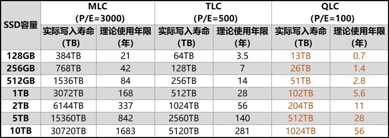 對于TLC來說,當(dāng)SSD容量達(dá)到了1TB的時候,寫入壽命也遠(yuǎn)遠(yuǎn)超過了128GB的MLC。