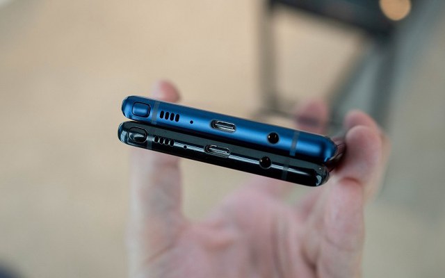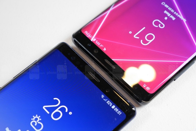 相比Note8,三星Note9正面進行了一些細節調整,比如屏幕尺寸大了0.1英寸、處理了一些機身開孔、額頭消隱了虹膜相機、下巴有所收窄,屏占比略有提升;