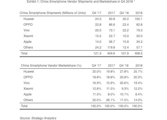 此外,國產手機品牌繼續強勢,Strategy Analytics的數據顯示,華為2018年全年在中國智能手機出貨量為1.051億臺,緊隨其后的是OPPO、vivo和小米,其全年出貨量分別為8280萬臺、7930萬臺和5000萬臺。
