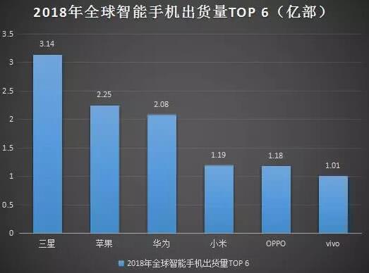 之前,國內調研機構旭日大數據給出的2018年全年的各廠商智能手機的出貨量報告中顯示,三星、蘋果和華為依然是位列前三,而小米、OPPO和vivo分列四到六位,對應全年出貨量是1.19億部、1.18億部和1.01億部,也就是說目前全球前六大手機廠商智能手機出貨量都破億,具體來說如下: