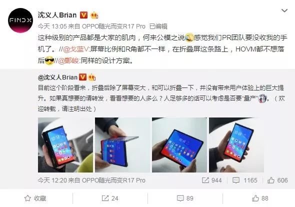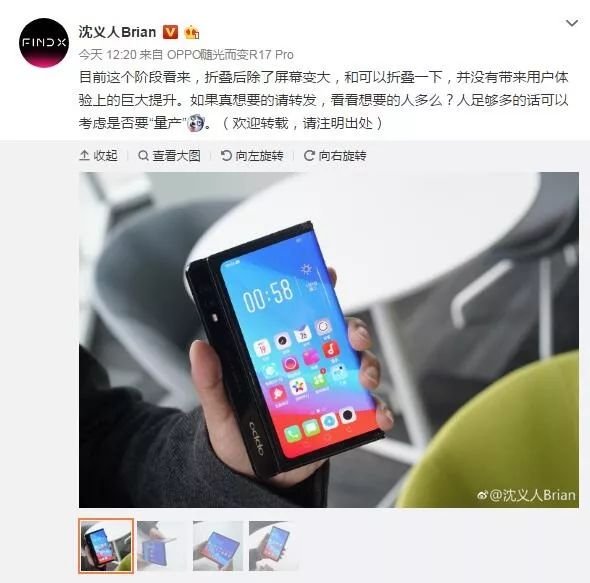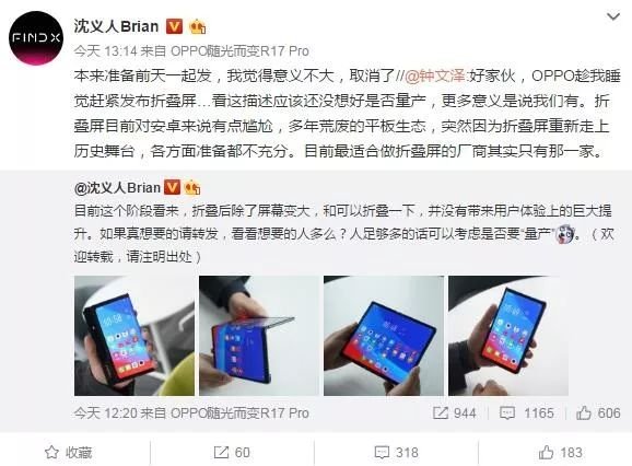 此外,沈義人還透露道:本來準備(OPPO折疊屏手機)前天一起發,我覺得意義不大,取消了。