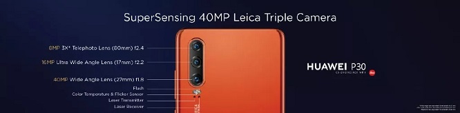 其中,華為P30采用了4000萬像素廣角鏡頭+1600萬像素超廣角鏡頭+800萬像素長焦鏡頭的三攝組合,華為P30支持3倍光學變焦,5倍混合變焦和30倍數碼變焦。華為P30系列還支持雙景錄像,全景和特寫同時拍攝。