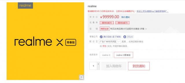此外,京東相關頁面中已經出現了Realme X的預售信息,而從該頁面中我們發現,本次推出的產品除了旗艦手機Realme X之外,還有一款“Realme X青春版”。從命名推測,Realme X青春版定位會相對低一些,面向更多主流消費人群。